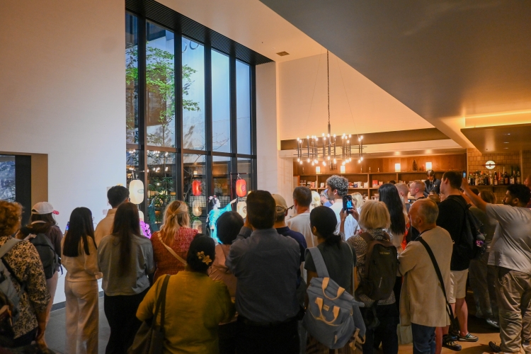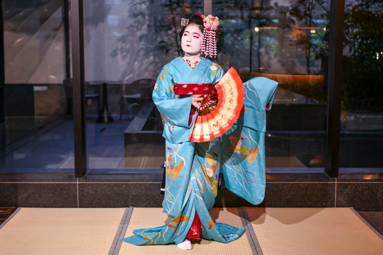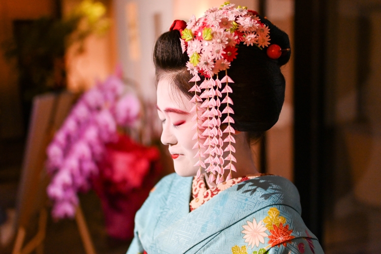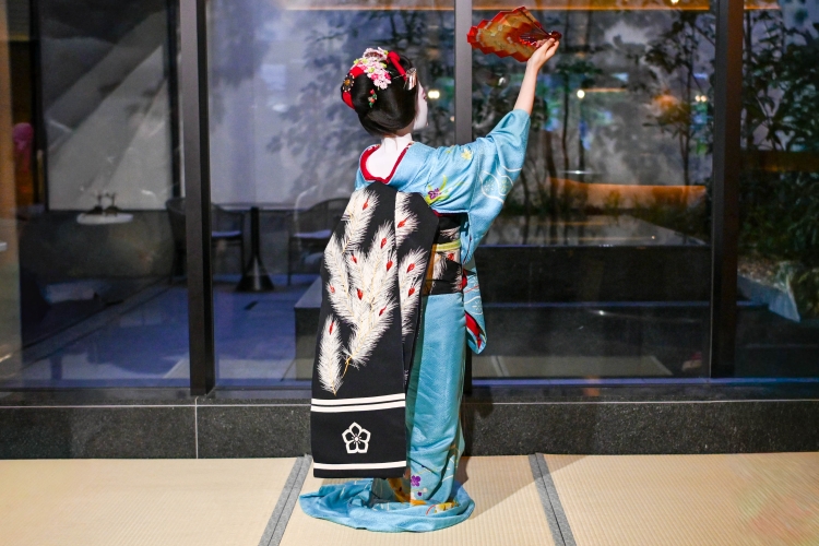 이벤트의 무대가 되는 HOTEL RESOL TRINITY KYOTO. 다다미가 깔린 공간에는 찻집 같은 분위기가 펼쳐집니다. 샤미센이나 피리의 음색이 조용히 울리는 중, 마이코 씨가 등장합니다.