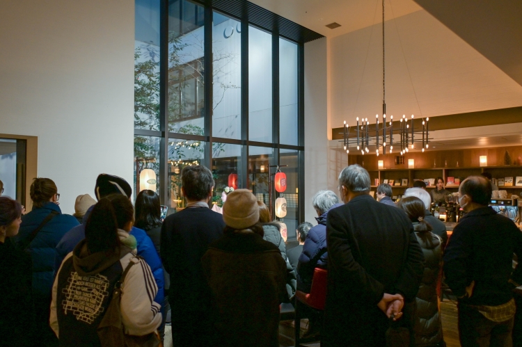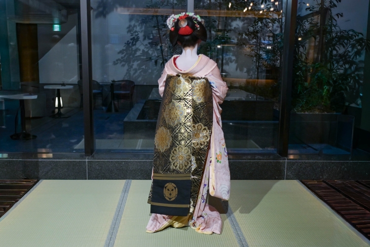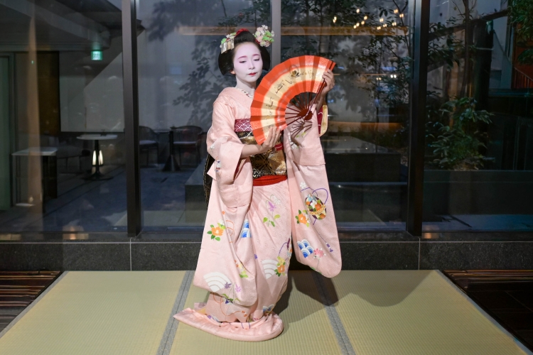 이벤트의 무대가 되는 HOTEL RESOL TRINITY KYOTO. 다다미가 깔린 공간에는 찻집 같은 분위기가 펼쳐집니다. 샤미센이나 피리의 음색이 조용히 울리는 중, 마이코 씨가 등장합니다.