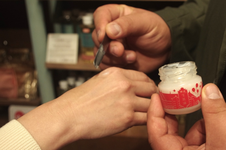 점내에는 상품 테스터가 준비되어 있어, 시험하면서 선택할 수 있습니다. 사진의 병들이의 마유는, 첨가물을 일절 넣지 않는 상질의 마유 100%의 상품. 쌀알 정도의 양을 손에 얹어 조금 친숙하게 한 후, 화장수를 붙이면 순식간에 침투해, 냄새나 끈적임은 전혀 없고, 촉촉한 매끈매끈의 사용감입니다.